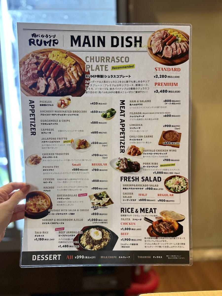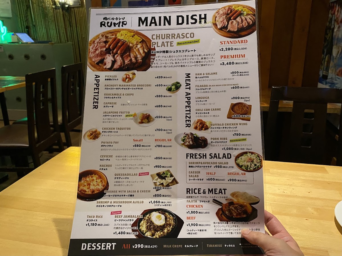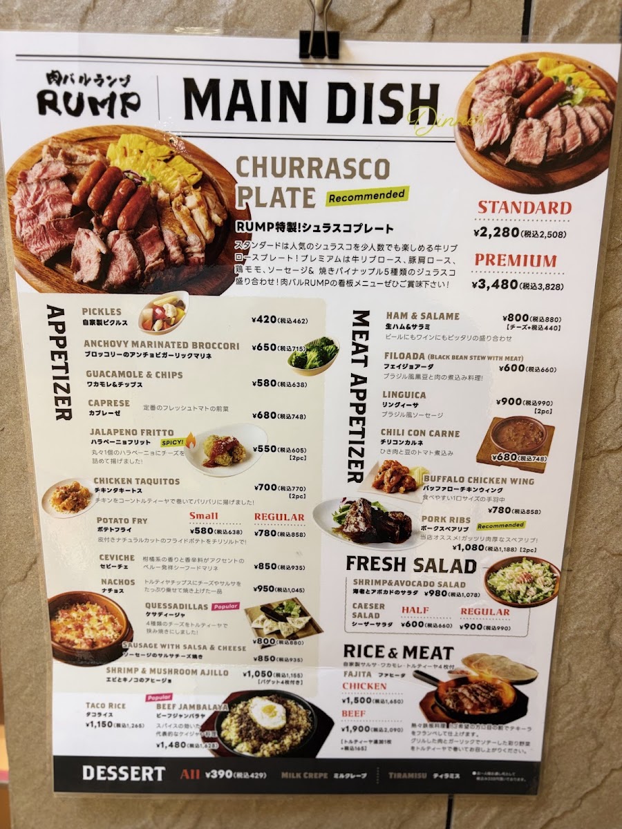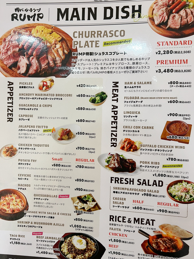At Rump Yotsuya Shinmichi-Dōri, the menu offers a rich selection of dishes that cater to various tastes, with a strong emphasis on high-quality meats and flavorful accompaniments. The Churrasco Plate Standard and Churrasco Plate Premium are standout options under the RUMPおすすめ肉メニュー section, showcasing the restaurant's specialty in grilled meats, with the premium version offering an even more refined experience.